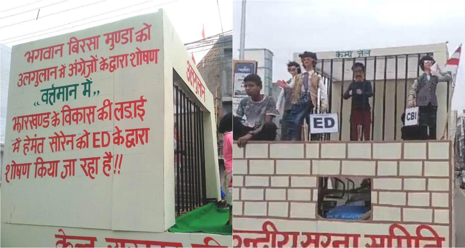 Different types of tableaux were brought during the procession, but the tableau, in which former Chief Minister Hemant Soren was seen lodged in jail, grabbed eyeballs.