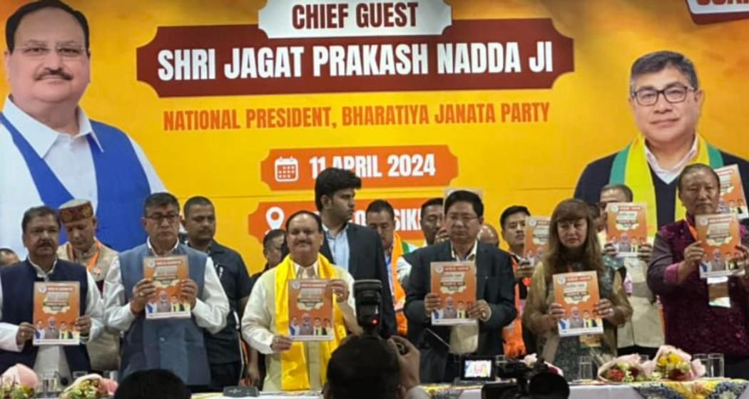 In a ceremony held in the state capital Gangtok, BJP President J P Nadda launched the party's manifesto alongside BJP Sikkim in charge Dilip Jaiswal, Sikkim state president DR Thapa, and other party officials.