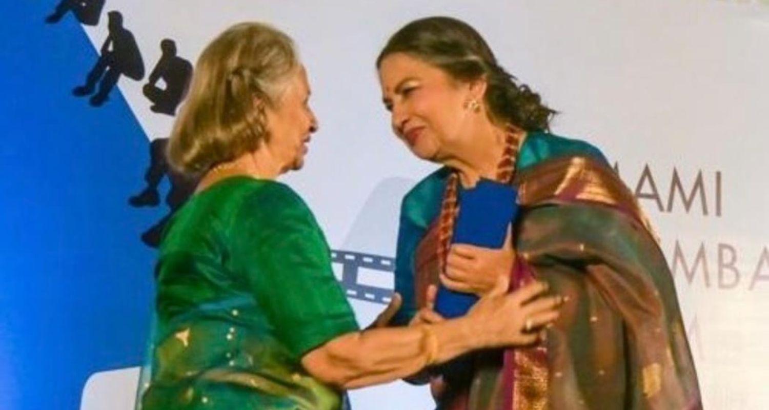 Waheeda Rehman honours Shabana Azmi with the Excellence in Cinema Award at MAMI. Image: X