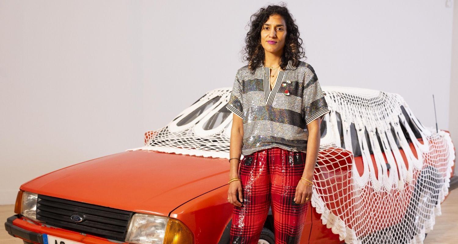 "It includes a Ford car and she talks about it as being one of her dad’s ambitions and migrant desires; when he moved from India to Glasgow, having a car like that was an aspiration. It’s covered in a crocheted cotton doily, so a kind of domestic object made very, very large where the cotton material relates to histories of migration and labour – of Indian people coming to the north of England after the war and working in cotton mills.” Other items making up Kaur’s display include a harmonium on a lush carpet inviting visitors to sit and observe the kinetic worship bells.