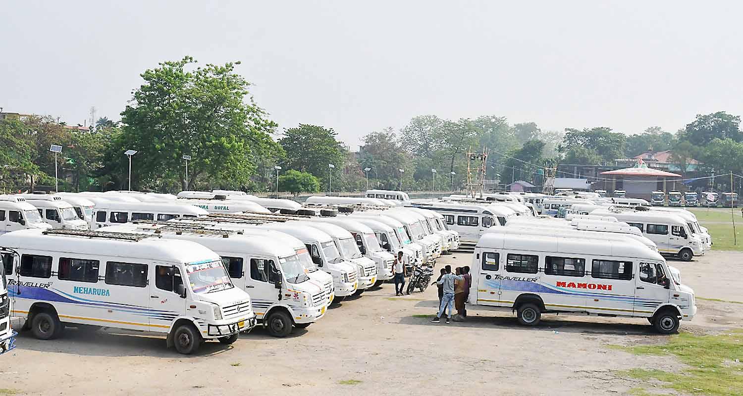Preparations for 2nd phase of LS polls: Vehicles requisitioned for the second phase of voting for Lok Sabha elections to be held on April 26, parked at Nehrubali Playground, in Nagaon district of Assam, on Wednesday.