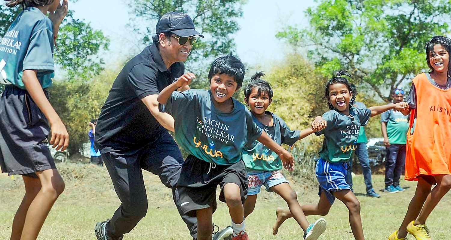 Former cricketer Sachin Tendulkar with wife Anjali Tendulkar join budding footballers from Yuwa Foundation for group photos in Ranchi. The cricket legend's support for grassroots sports uplifts spirits and inspires young athletes.