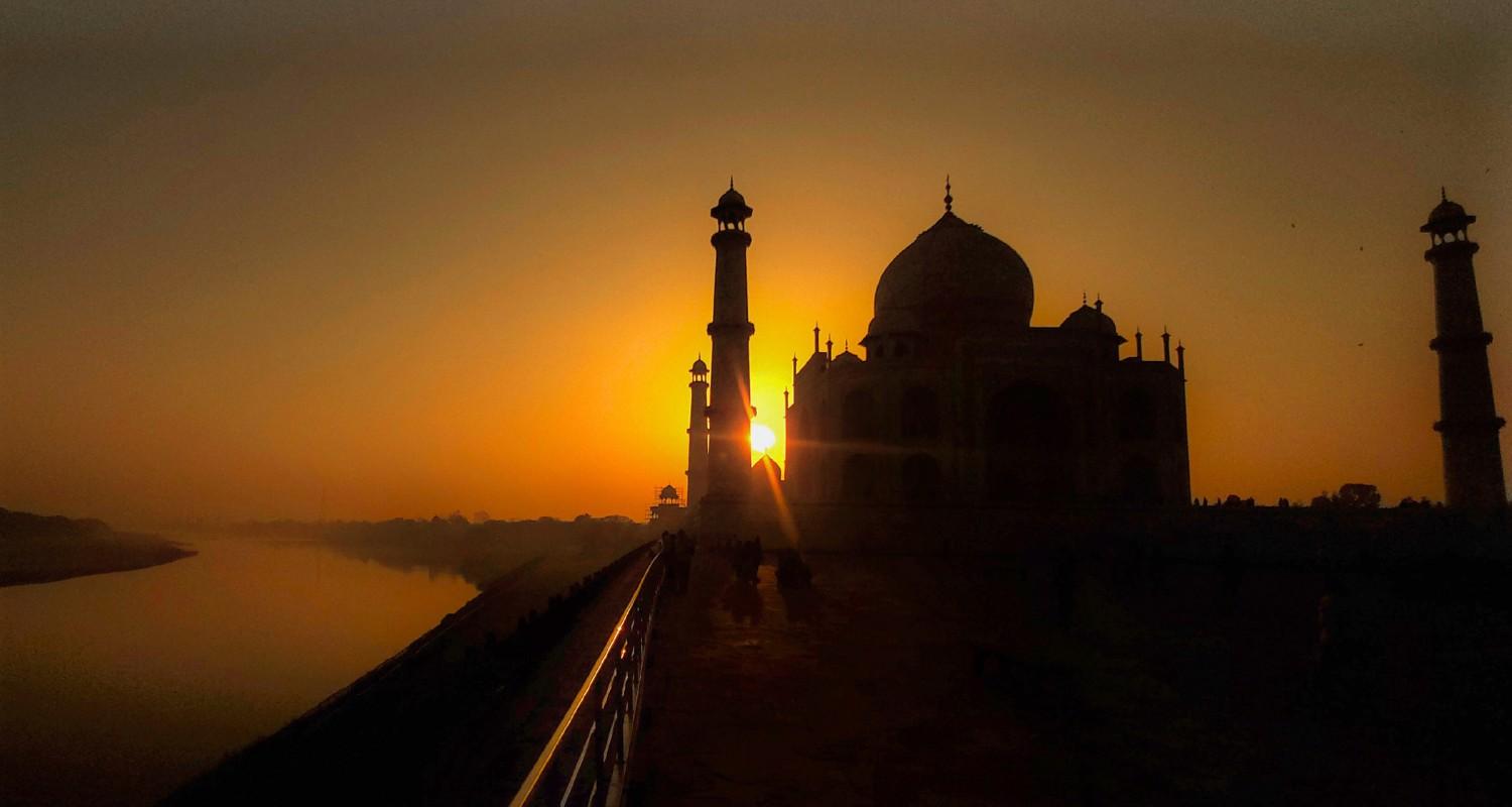The silhouette of the Taj Mahal emerges against the vibrant hues of a sunrise, casting a mesmerising shadow that epitomizes the majestic beauty of India's architectural marvel.