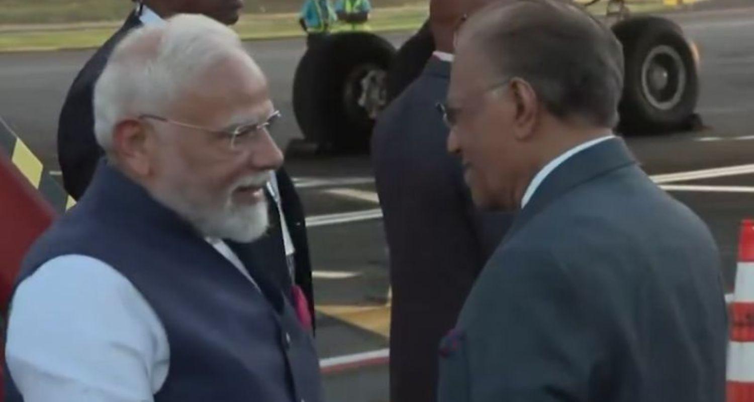 Prime Minister Narendra Modi being welcomed by his Mauritius counterpart Navin Ramgoolam, on his arrival in the island nation on Tuesday - Image via X.