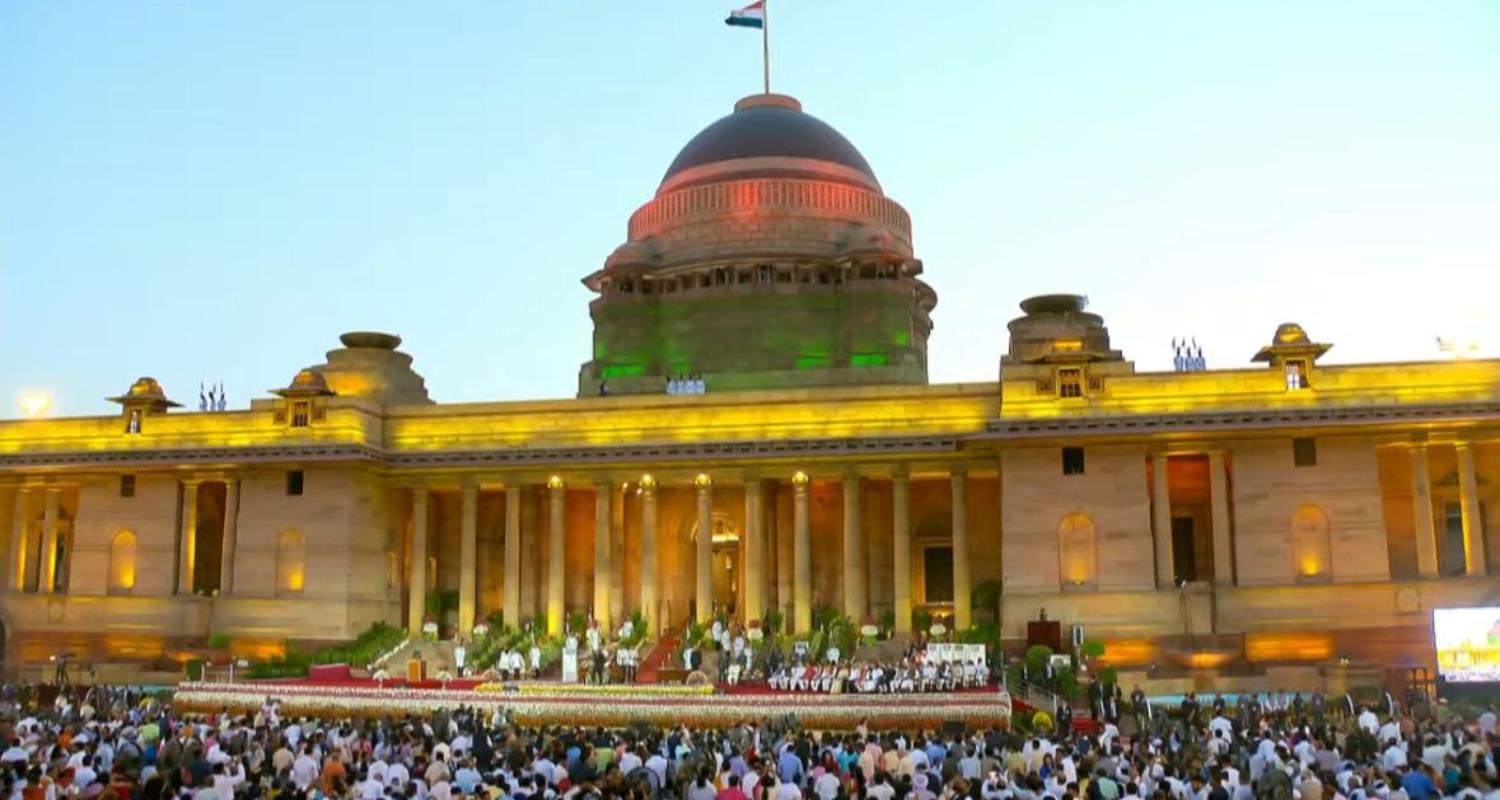 As the blazing sunny day dulled into a warm evening, the swearing-in ceremony of the Modi 3.0 government unravelled against the backdrop of the magnificent sandstone dome of the columned presidential palace lit in saffron, white and green.