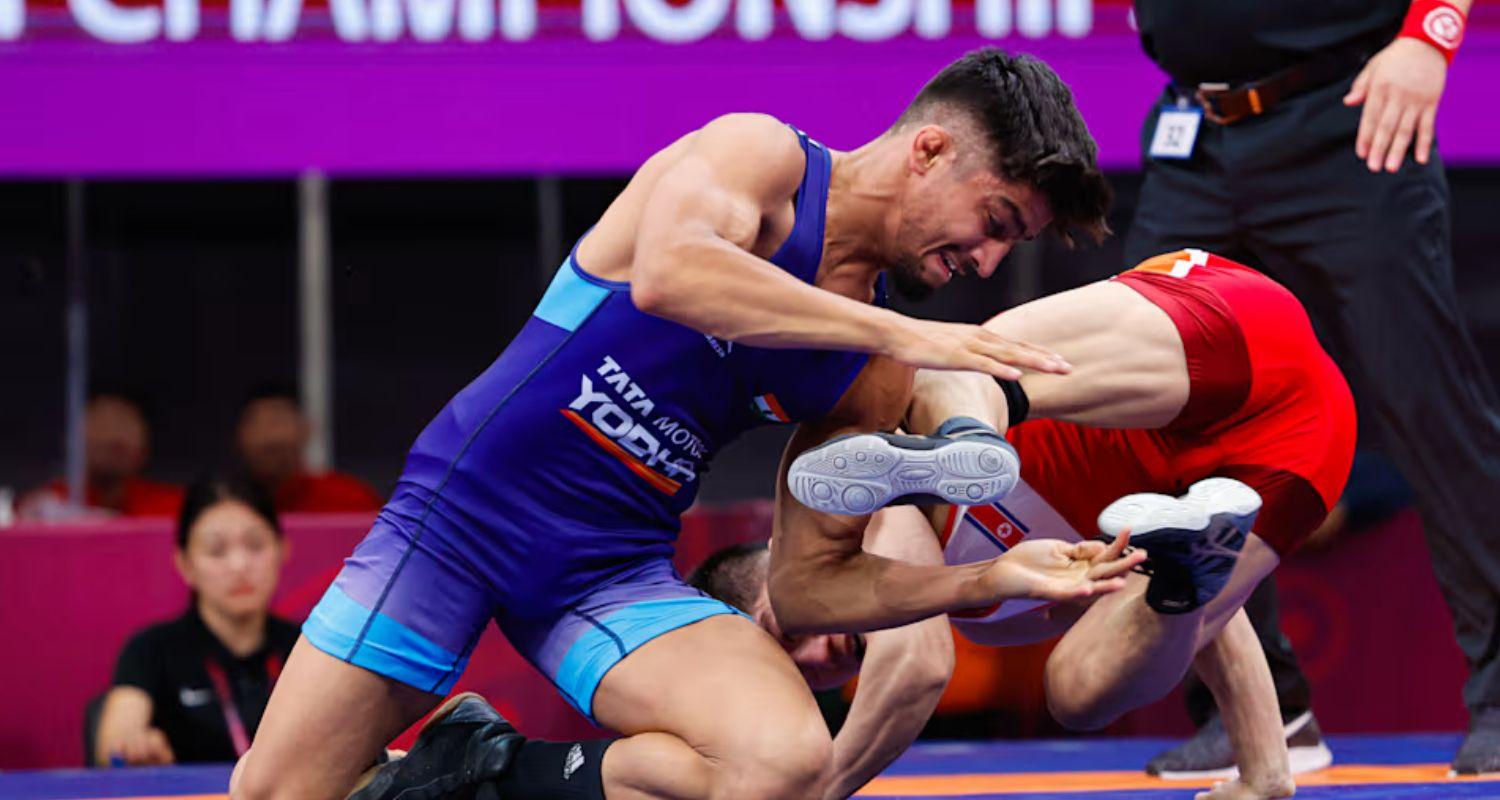 Punia, who could not qualify for the Paris Olympics, began his comeback with a hard-fought contest against Bekzat Rakhimov.