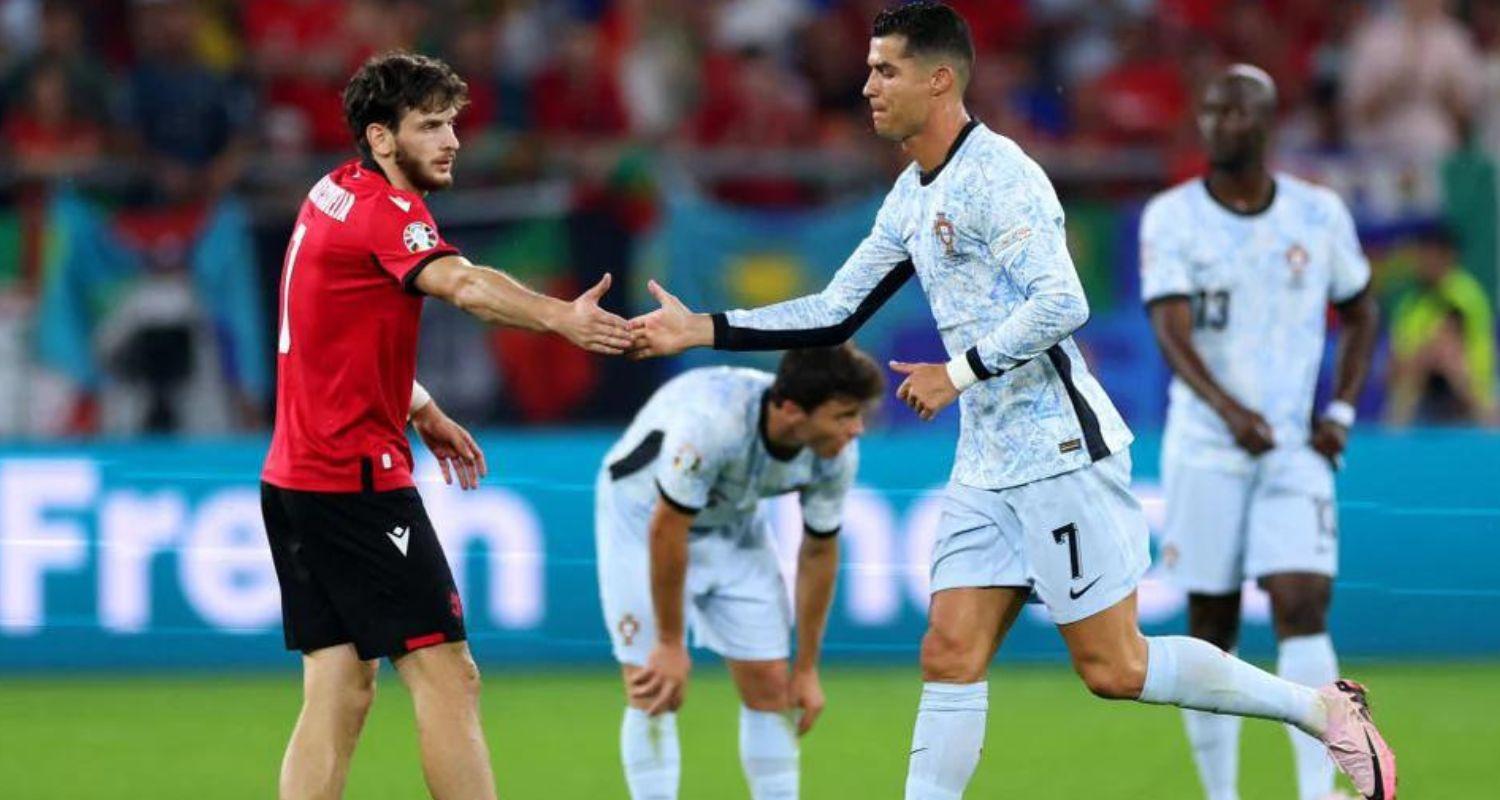 Portugal captain Cristiano Ronaldo and Georgian Striker Khvicha Kvaratskhelia share a moment of mutual appreciation on the field.