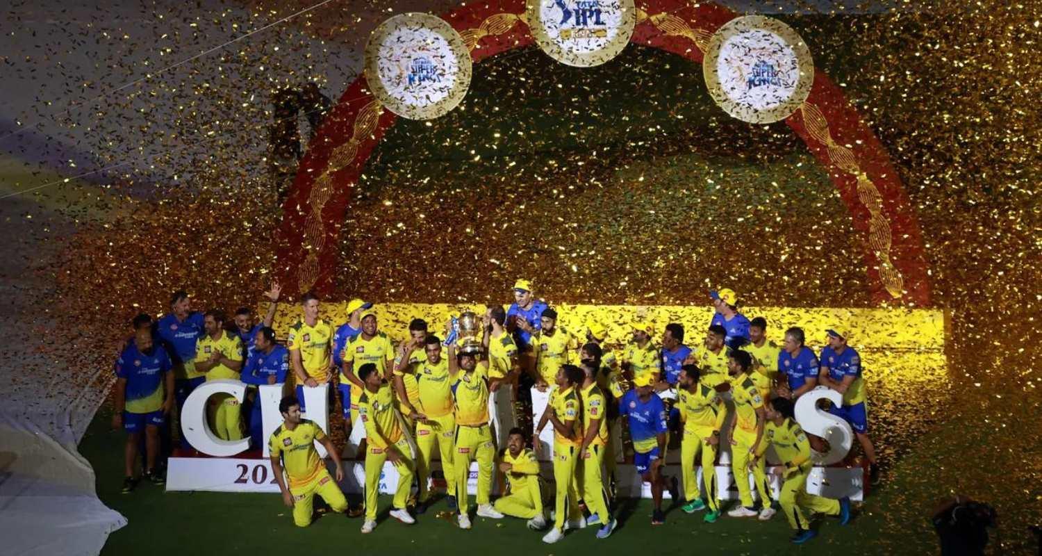 Chennai Super Kings celebrating their victory at the 2023 IPL final match.