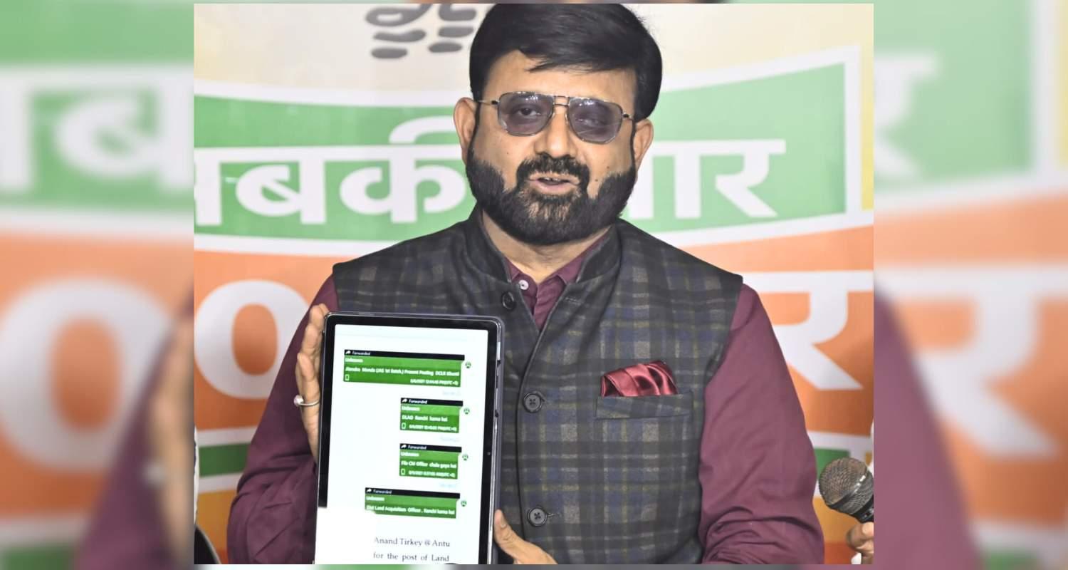 Caption: Jharkhand BJP Spokesperson Pratul Shahdeo showing the WhatsApp chat between JMM leaders and land brokers for transfer of an official during a press conference in Ranchi on Tuesday.